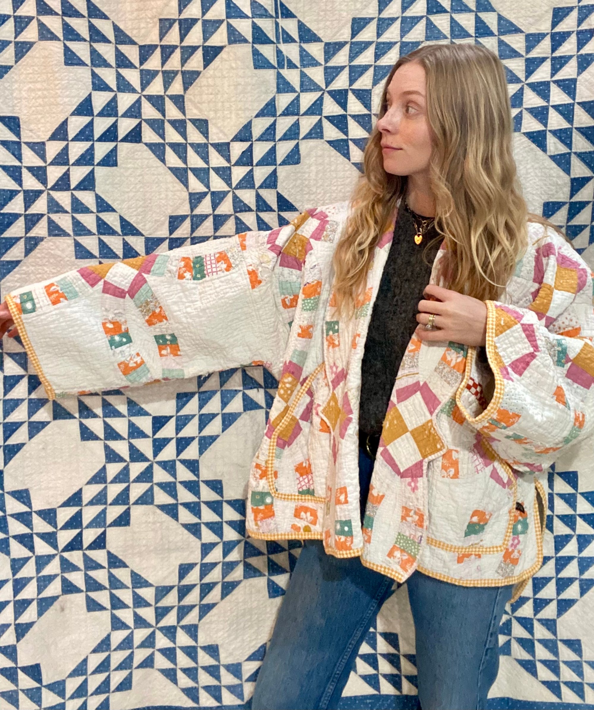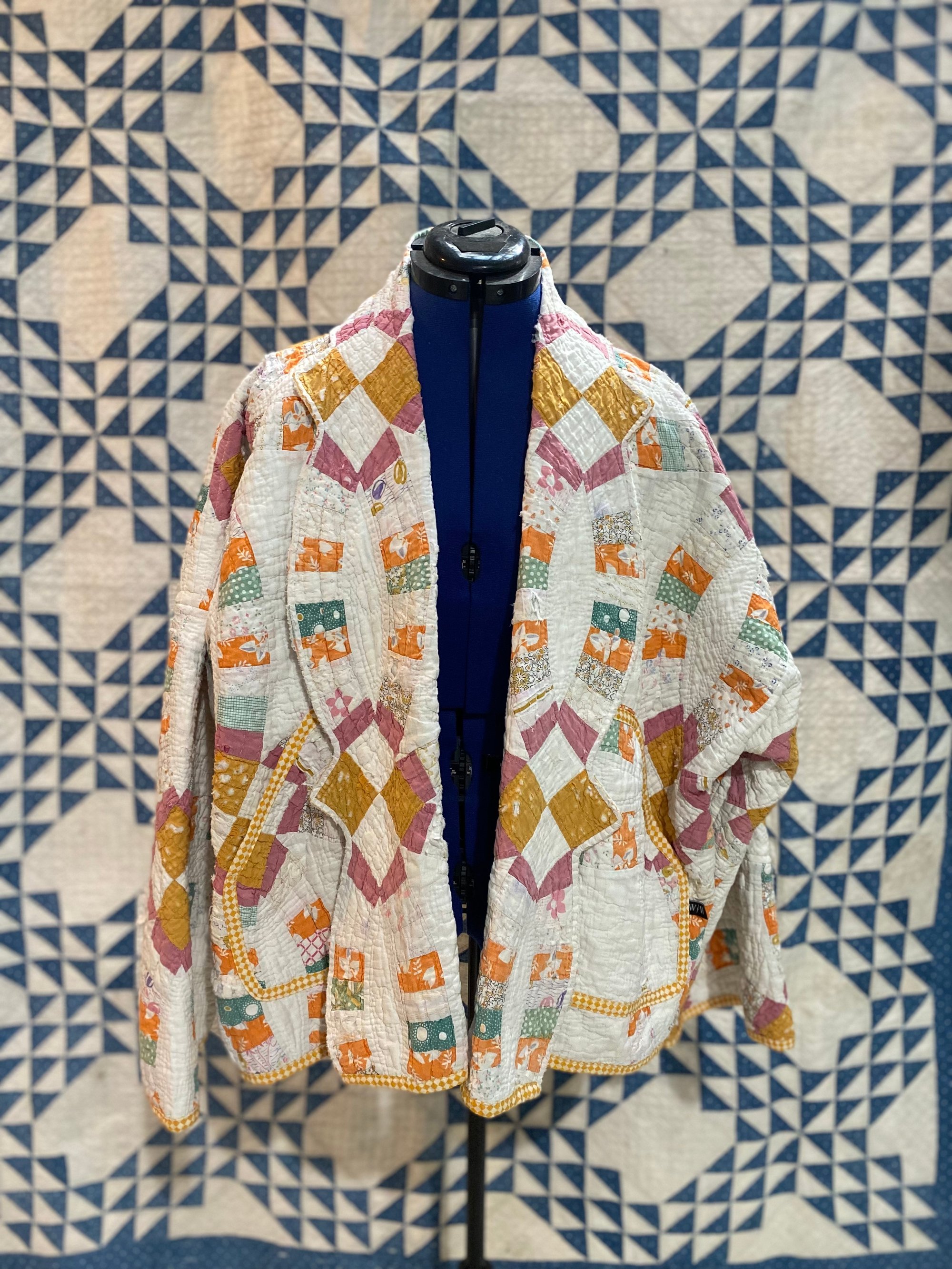 All of our coats are made from vintage or antique quilts and blankets, and are 100% hand made by me in Minneapolis. That means most of these textiles are not perfect, and we like it that way! These coats are wearable art! They all have small character flaws, possible stains, rips etc.