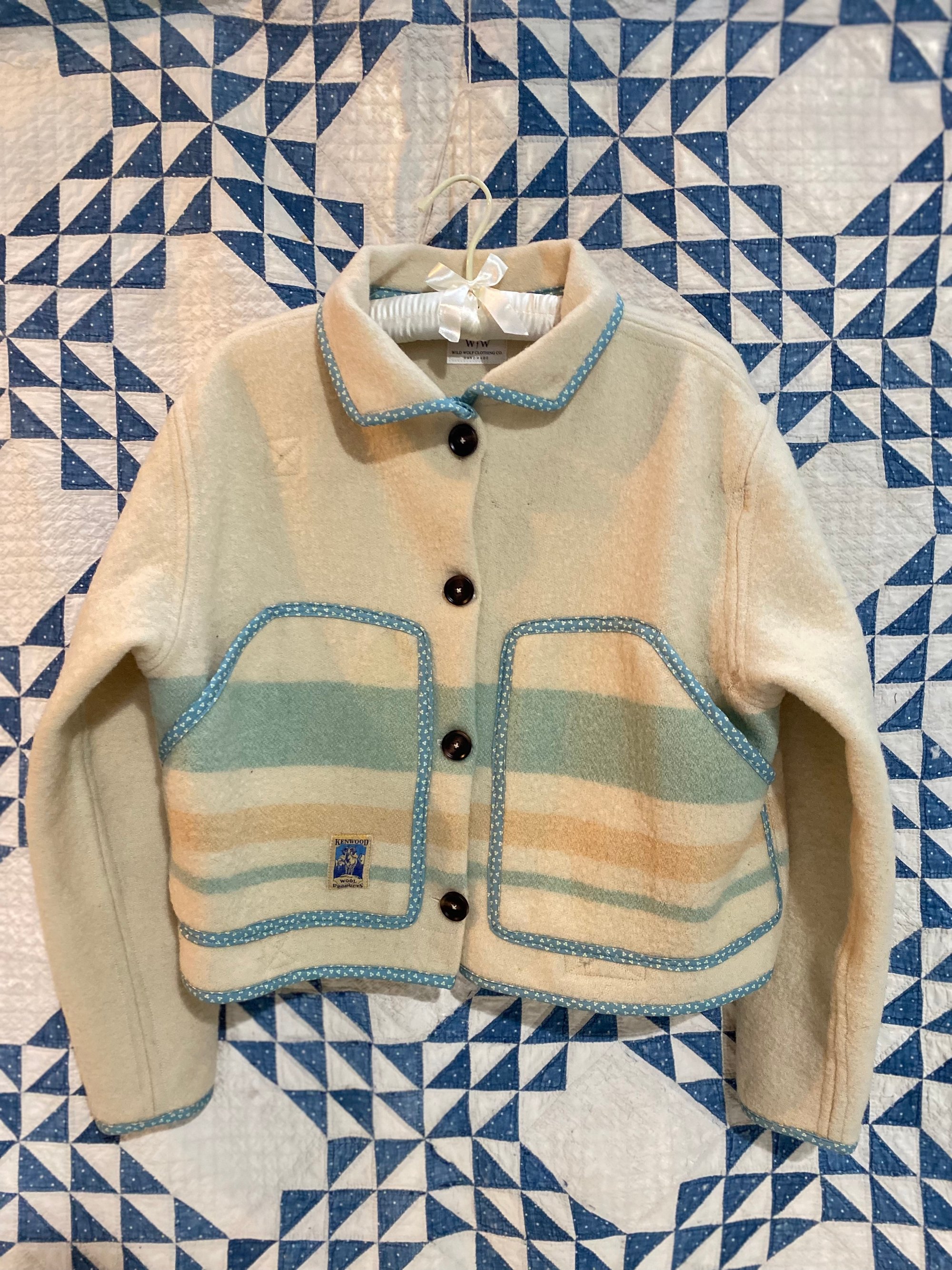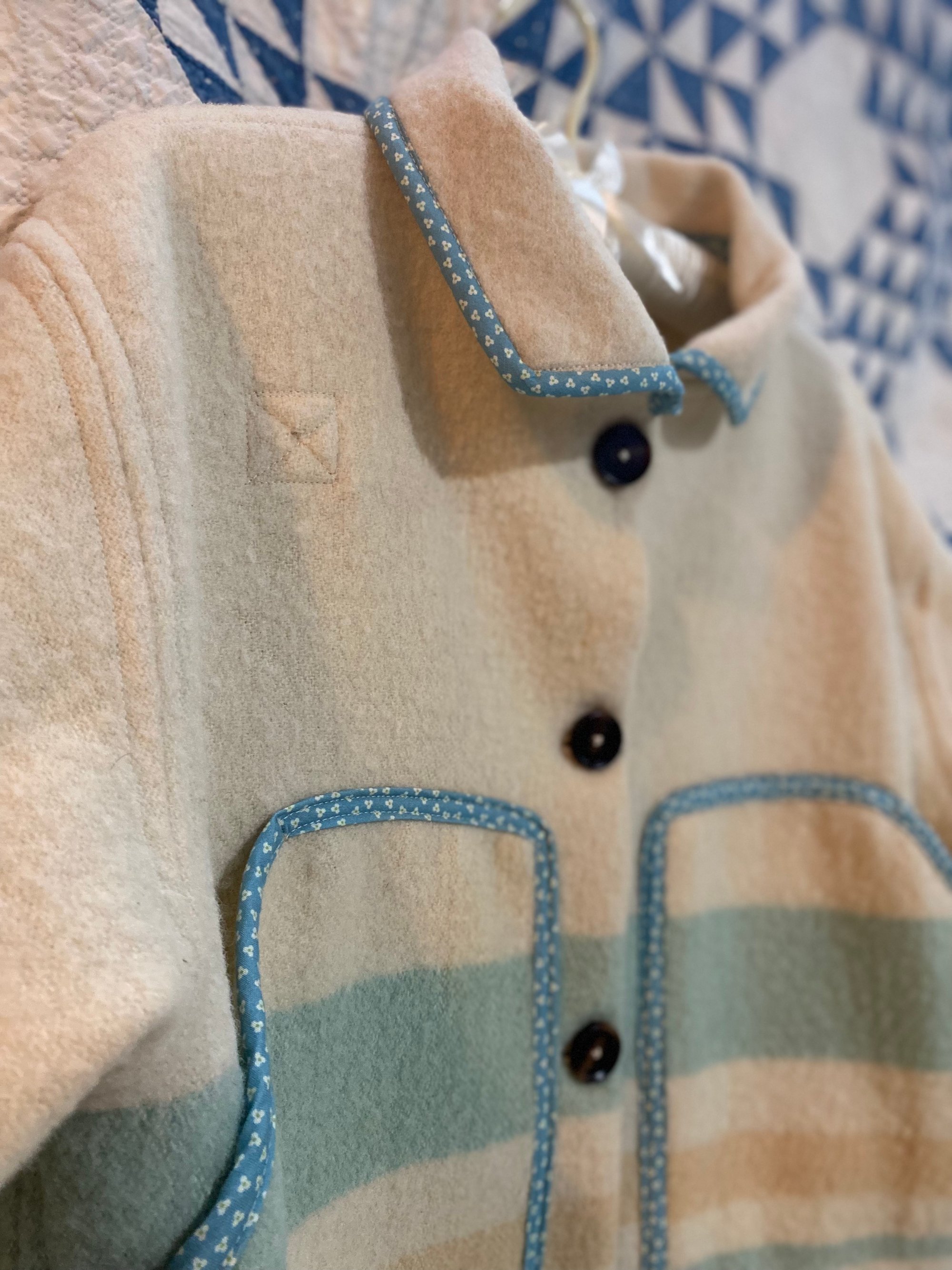 All of our coats are made from vintage or antique quilts and blankets, and are 100% hand made by me in Minneapolis. That means most of these textiles are not perfect, and we like it that way! These coats are wearable art! They all have small character flaws, possible stains, rips etc.